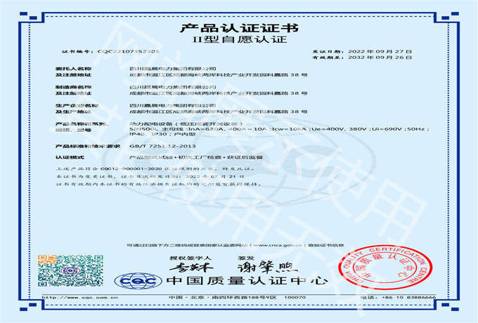 嘉晨电力-低压成套证书 SIN500L动力配电设备