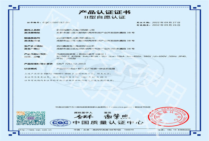 嘉晨电力-低压成套证书 SIN500Z双电源转换装置