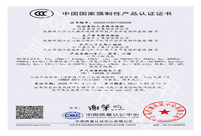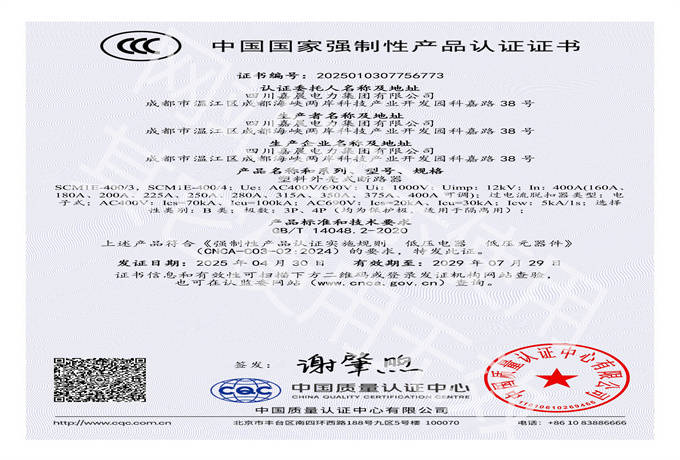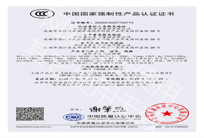 嘉晨电力-低压塑壳-框架CCC证书