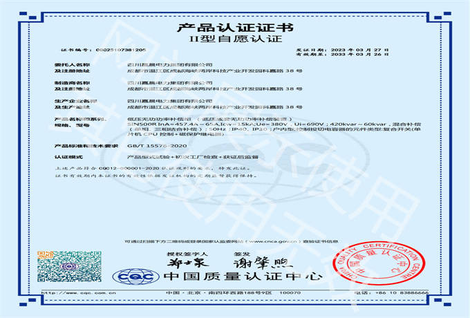 嘉晨电力-低压成套证书 SIN500R低压无功补偿柜