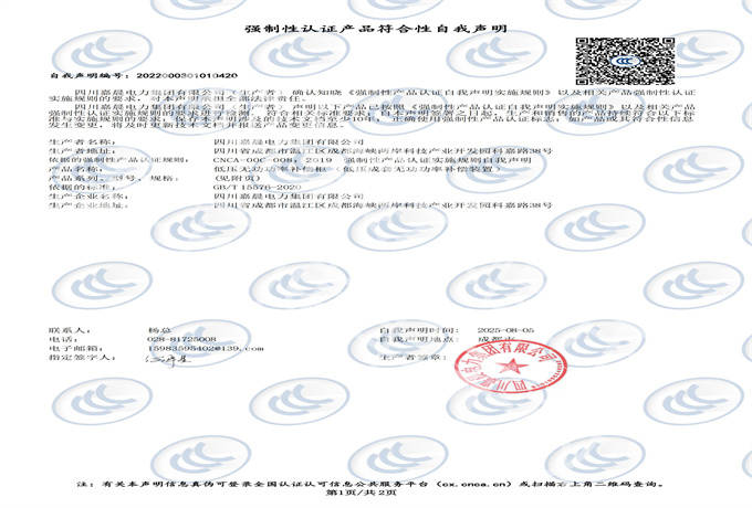 嘉晨电力-低压成套证书 SIN500L动力配电设备