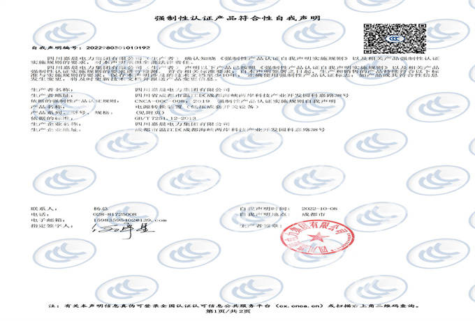 嘉晨电力-低压成套证书 SIN500S低压成套开关设备